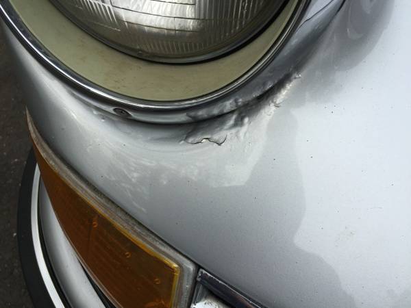 This car is in good condition, but there are two small rust bubbles showing under the headlights. Also there is a small ding in the front bumper and a slight crack in the paint behind the driver door. It looks like it has been resprayed. The passenger door pocket is missing as is the top sill.